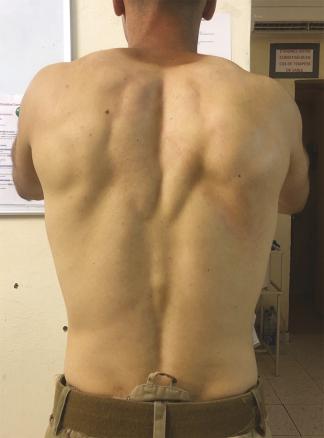L’appui des membres supérieurs tendus contre un mur (manoeuvre de wall push-up press) met en évidence une saillie postérieure globale de la scapula signe dyskinésie scapulaire dynamique, ou scapula alata.