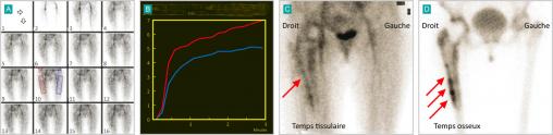 A. Temps artériel.B. Courbes activité-temps, réalisées au temps artériel. Elles montrent une hypervascularisation du fémur droit (courbe rouge) par rapport au côté sain (courbe bleue).C. Temps tissulaire qui montre un halo périprothétique.D. Temps osseux, qui montre une hyperfixation périprothétique pathologique sur la queue de la prothèse.Résultat : scintigraphie osseuse positive aux 3 temps, fortement évocatrice de descellement septique de la queue de la prothèse.
