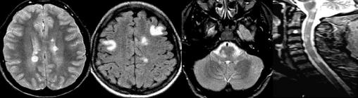 De gauche à droite : périventriculaires, corticales/juxtacorticales, infratentorielles et médullaires. Les lésions périventriculaires doivent être au contact des ventricules et sont ovoïdes et perpendiculaires à l’axe des ventricules. Les lésions juxtacorticales doivent être au contact du cortex.