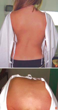 Scoliose dorsale droite d'une adolescente de 13 ans. Image A : Vue de dos.Image B : Jeune fille penchée en avant pour mesurer la gibbosité.