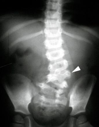 Radiographie du rachis lombaire de face montrant une scoliose par anomalie congénitale (hémivertèbre lombaire).