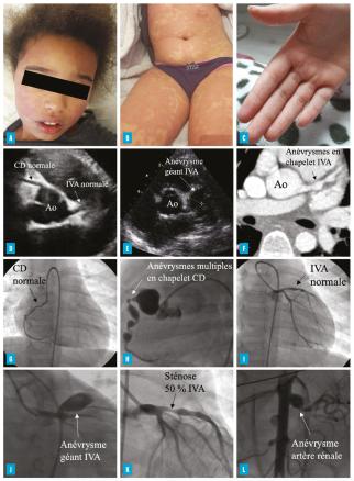 G, H, I, J, K. Coronarographie de face : coronaire droite normale (G) ; coronaire droite avec multiples anévrismes en chapelet, à un an d’évolution (H) ; coronaire gauche normale (I) ; anévrisme géant persistant de l’IVA, à un an d’évolution (J) ; sténose de 50 % du segment I de l’IVA, après un an d’évolution d’un anévrisme géant (K). L. Angiographie de l’aorte descendante de face avec anévrismes vasculaires multiples dont un important au niveau de l’artère rénale gauche.