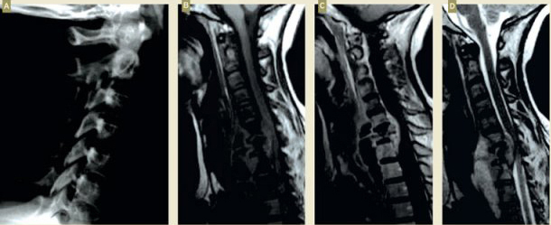 A. Radiographie standard ; B. T1 ; C. T1 + gadolinium ; D. T2.Les spondylodiscites tuberculeuses représentent environ 2 % des cas de tuberculose. Une spondylodiscite tuberculeuse peut se manifester par une douleur isolée. Le diagnostic repose sur l’IRM.