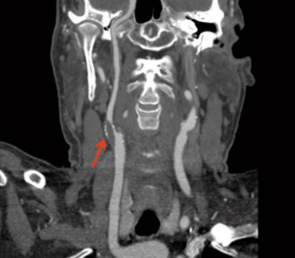 Angioscanner des troncs supra-aortiques, sténose de l'origine de la carotide interne droite associée à des calcifications