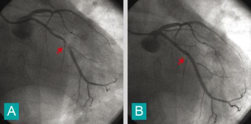 Coronarographie d'un patient ayant un syndrome coronaire aigu avec sous-décalage de ST et élévation de troponine.Les flèches rouges indiquent la présence d'une sténose coronarienne serrée avec volumineux thrombus intraluminal (A), et la disparition de la lésion après angioplastie avec pose d'une endoprothèse coronarienne (B).