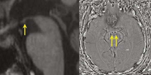 À droite : IRM cérébrale en séquence de susceptibilité magnétique. Nécrose hémorragique des deux corps mamillaires (flèches).