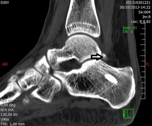 La TDM met en évidence un fragment osseux triangulaire surnuméraire : le trigone (flèche). Cette anomalie congénitale est due à l’absence de soudure du versant postérieur de l’astragale, qui devrait avoir lieu vers l’âge de 12 ans.