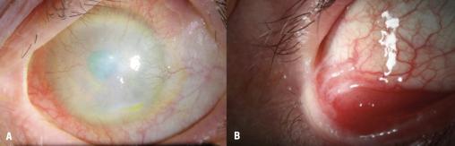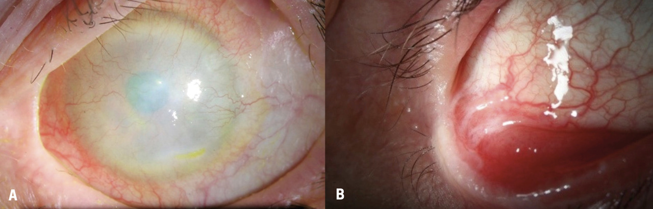 A. Opacité et néovascularisation cornéenne, kératinisation conjonctivale secondaires à un syndrome de Lyell sous Lamictal. B. Symblépharon inférieur (bride conjonctivale) secondaire à un syndrome de Lyell sous Bactrim.