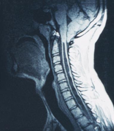 Il s'agit d'une syringomyélie.Le diagnostic de syndrome médullaire reste avant tout clinique. Le diagnostic étiologique de syndrome médullaire a été nettement amélioré par la résonance magnétique nucléaire qui permet rapidement d'éliminer une cause compressive et d'orienter l'exploration étiologique. Une fois éliminée une cause compressive, la ponction lombaire garde toute sa place pour compléter l'approche diagnostique. Cela doit aboutir le plus rapidement possible à un traitement, curatif dans certains cas, symptomatique dans les autres cas, notamment en cas de syringomyélie. La syringomyélie est une cavité centromédullaire d'origine malformative ou post-traumatique. La symptomatologie est principalement sensitive, thermo-algique, suspendue, par lésion des fibres spinothalamiques centromédullaires. Une atteinte motrice est plus inconstante, témoignant d'une extension de la cavité vers la corne antérieure médullaire, et se manifeste par une amyotrophie et une abolition des réflexes ostéotendineux dans le territoire concerné.Pour en savoir plus :- de Seze J. Affections non traumatiques de la moelle épinière. Rev Prat 2001;51(11):1215-8.- Fleury MC, Tranchant C. Compression médullaire non traumatique et syndrome de la queue de cheval. Rev Prat 2006;56(4):419-23.- Caire F, Moreau JJ. Compression médullaire non traumatique. Rev Prat 2010;60(8):1144-8.