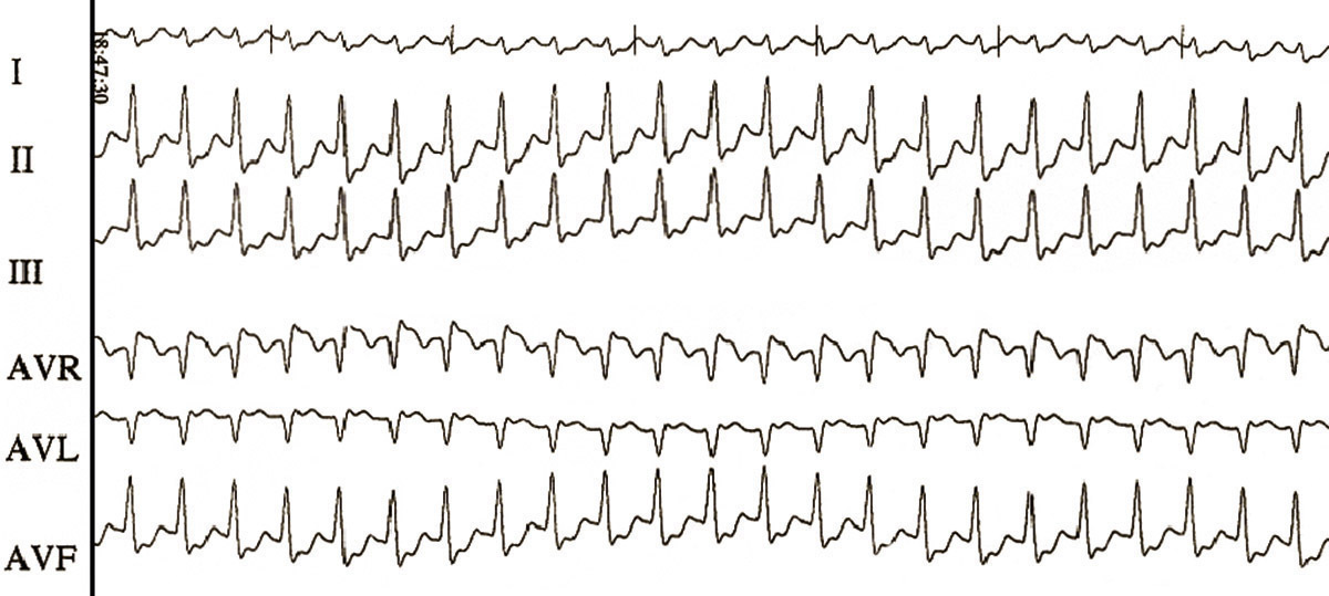 ©La Revue du Praticien Tachycardie jonctionnelle habituelle, à 170 batt/min, à QRS fins ; les auriculogrammes sont difficiles à voir (positifs en VR, à la fin du complexe QRS, ce qui évoque une réentrée intranodale).