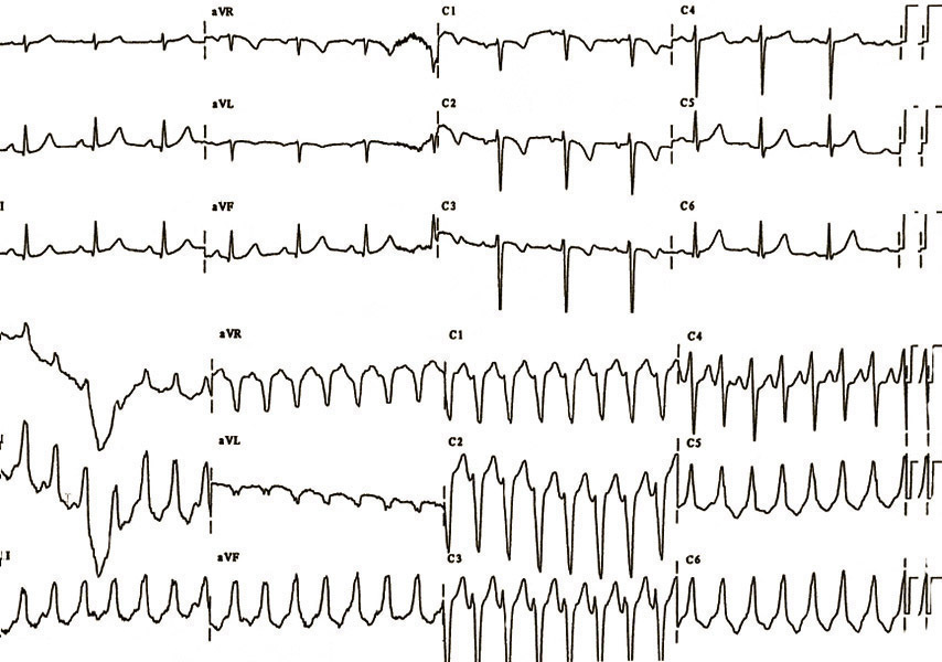©La Revue du Praticien Tachycardie ventriculaire à type de retard gauche à 180 batt/min. Chez ce patient, en rythme sinusal, noter l'inversion de l'onde T en V1-V2-V3 ; l'ensemble évoque la maladie arythmogène du ventricule droit.