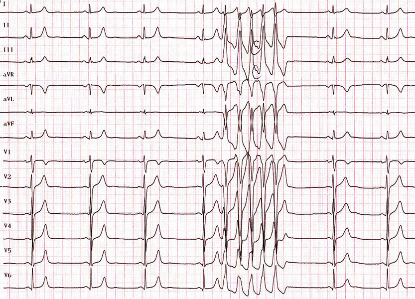 ©La Revue du Praticien Tachycardie ventriculaire non soutenue à 210 batt/min. Onde P dissociée bien visible après le 3e battement en tachycardie ventriculaire. Le retard est gauche, l'axe à 90° compatible avec une origine infundibulo-pulmonaire.