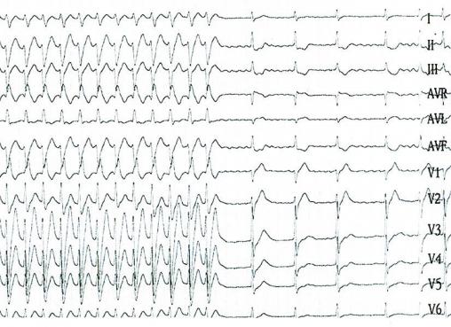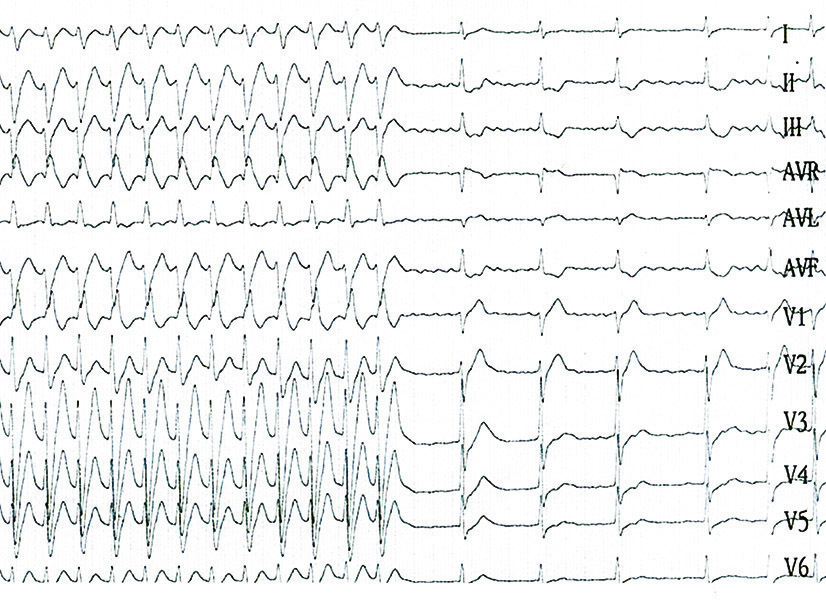 ©La Revue du Praticien Tachycardie ventriculaire fasciculaire sur cœur sain. La fréquence cardiaque est à 180 batt/min ; la tachycardie ventriculaire est à type de retard droit et axe gauche, évoquant une origine postéro-septale du ventricule gauche.
