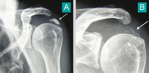 Tendinopathie calcifiante de l'épaule (A). Noter sa quasi disparition après une crise douloureuse aiguë hyperalgique (B). Voir : Guggenbuhl P, Coiffier G, Albert JD, Chalès G. Dossier. Arthropathies microcristallines. Rev Prat 2015;65(5):665-82.