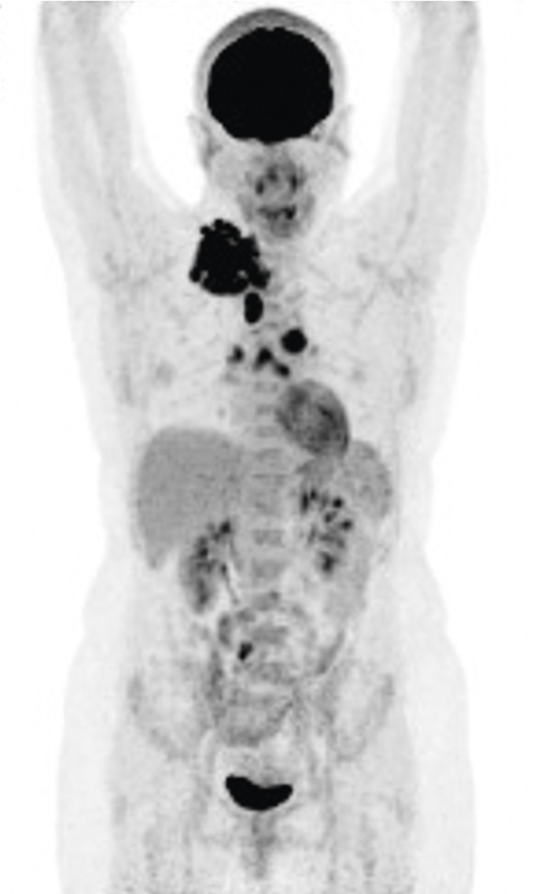 TEP/Scanner lors du bilan initial d'une patiente de 31 ans présentant un lymphome de Hodgkin montrant un hypermétabolisme supra diaphragmatique avec également une atteinte splénique et des ganglions sous diaphragmatiques.