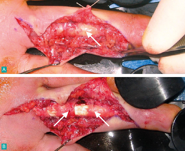 (A) Aspect peropératoire d’un phlegmon des gaines avant synovectomie (face palmaire). On remarque l’aspect inflammatoire de la synoviale (flèche). (B) Même doigt après synovectomie. On remarque les poulies qui doivent être respectées (flèches). Tiré de : Bouiller K, Menu G, Menez C, Chirouze C. Infection aiguë des parties molles. Rev Prat 2018;68(3):e181-8.
