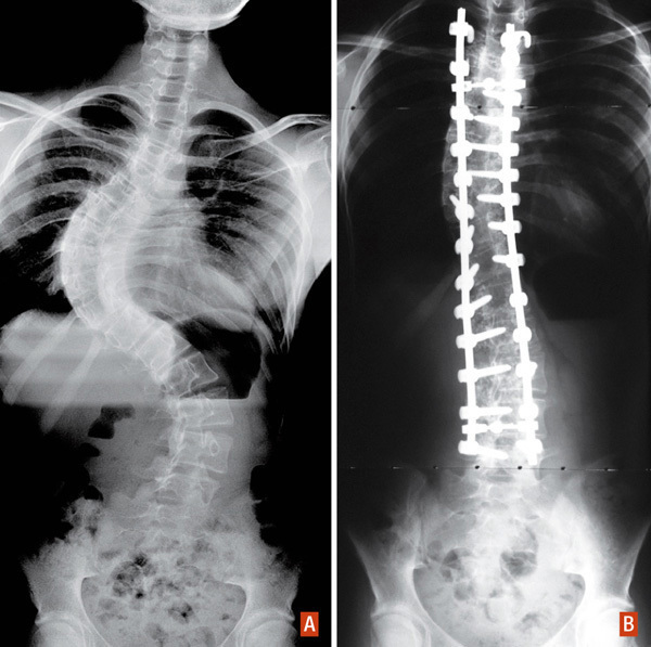 Traitement chirurgical d’une scoliose combinée thoracique droite et lombaire gauche sévère. A : radiographie de face préopératoire. B : radiographie de face postopératoire.