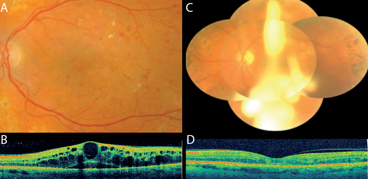 Traitement d’un œdème maculaire par injection intravitréenne de corticoïdes.A. Œdème maculaire central (photo couleur du fond d’œil)B. La tomographie en cohérence optique montre l’épaississement de la rétine maculaire avec de nombreux kystes intrarétiniens.C. Photo couleur du fond d’œil après injection intravitréenne d’acétonide de triamcinolone.D. Contrôle quelques jours plus tard : la tomographie en cohérence optique montre une réduction majeurede l’épaississement rétinien maculaire avec disparition des kystes d’œdème.