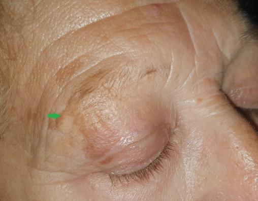 Raréfaction des sourcils du côté droit, qui résulte d’un frottement de cette zone. Extrait de : Trichoteiromanie