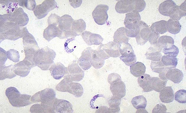 Formes sanguines trypomastigotes. À noter la forme en croissant et le très gros blépharoblaste subterminal.
