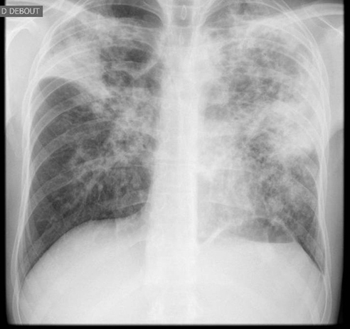 La Revue du Praticien - Hélène Leroy Radiographie thoracique. Lésions infiltratives bilatérales prédominant aux sommets, avec rétraction du sommet droit (déviation de la trachée).