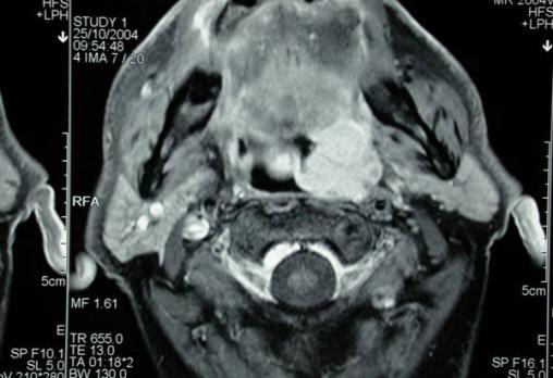 Coupe IRM axiale montrant une tumeur de la paroi latérale gauche de l’oropharynx. Le contraste tissulaire est bien supérieur.