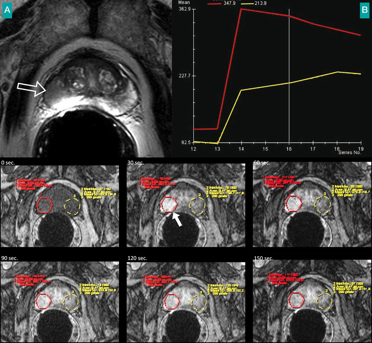 Patient de 67 ans adressé pour élévation du PSA à 7,8 ng/mL. Biopsies positives au niveau du lobe droit avec un score de Gleason 7. (A) Imagerie par résonance magnétique, séquence pondérée en T2. Lésion nodulaire de la prostate périphérique au niveau du lobe droit (flèche ouverte), ne franchissant pas la capsule. (B) Les séquences dynamiques montrent un rehaussement intense et précoce de la lésion à 30 s (flèches pleines), confirmé par les courbes de rehaussement. La courbe rouge correspond au côté pathologique.