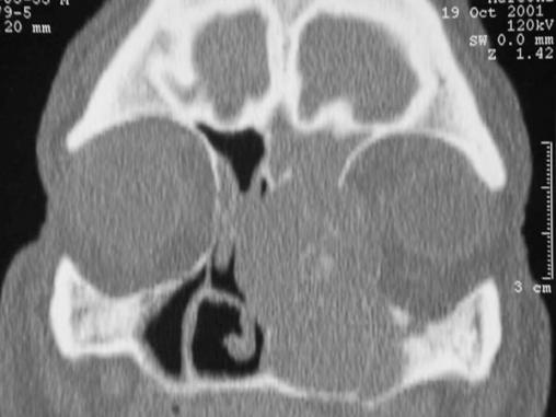 Coupe scannographique coronale montrant une tumeur ethmoïdale gauche invasive, lysant les parois médiale et latérale. Cet aspect agressif est fortement évocateur d’un adénocarcinome de l’ethmoïde. Ces tumeurs restent latentes très longtemps et sont souvent diagnostiquées à un stade tardif. Elles doivent être évoquées et recherchées devant toute sinusite rebelle au traitement, notamment si le patient rapporte des épisodes d’épistaxis récidivants toujours du même côté.