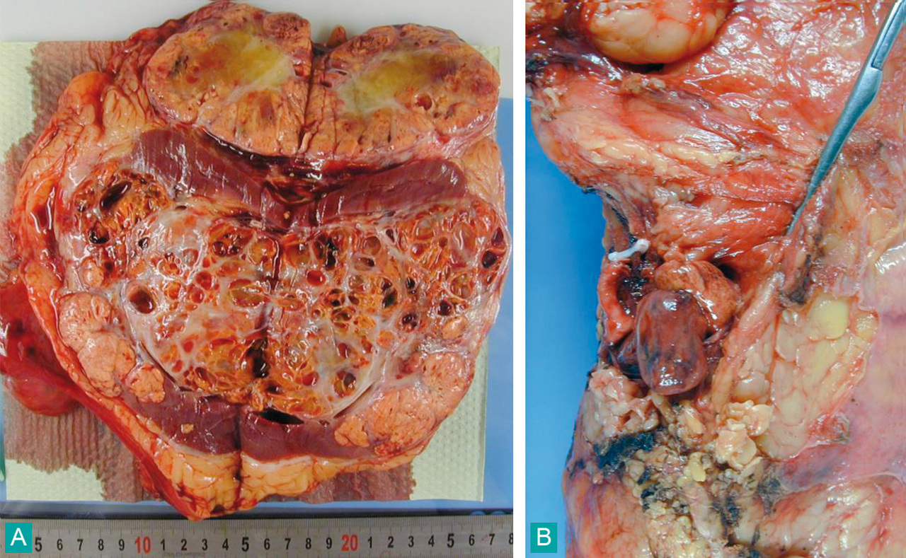 Néphrectomie élargie pour volumineuse tumeur rénale.Examen à l'état frais : volumineux cancer du rein de 12 cm de grand axe, de couleur jaune orangé, mal limité avec thrombose de la veine rénale (VR) (pT3a). La surrénale tumorale (ST) est séparée du rein tumoral (RT) par du rein sain (RS) ce qui correspond à une métastase de la tumeur rénale (M+) et non à un envahissement local.Congélation pour tumorothèque d'un fragment de rein tumoral (RT + puce blanche), de nodule métastatique de la surrénale (ST + puce verte) et de rein sain (RS + puce jaune).