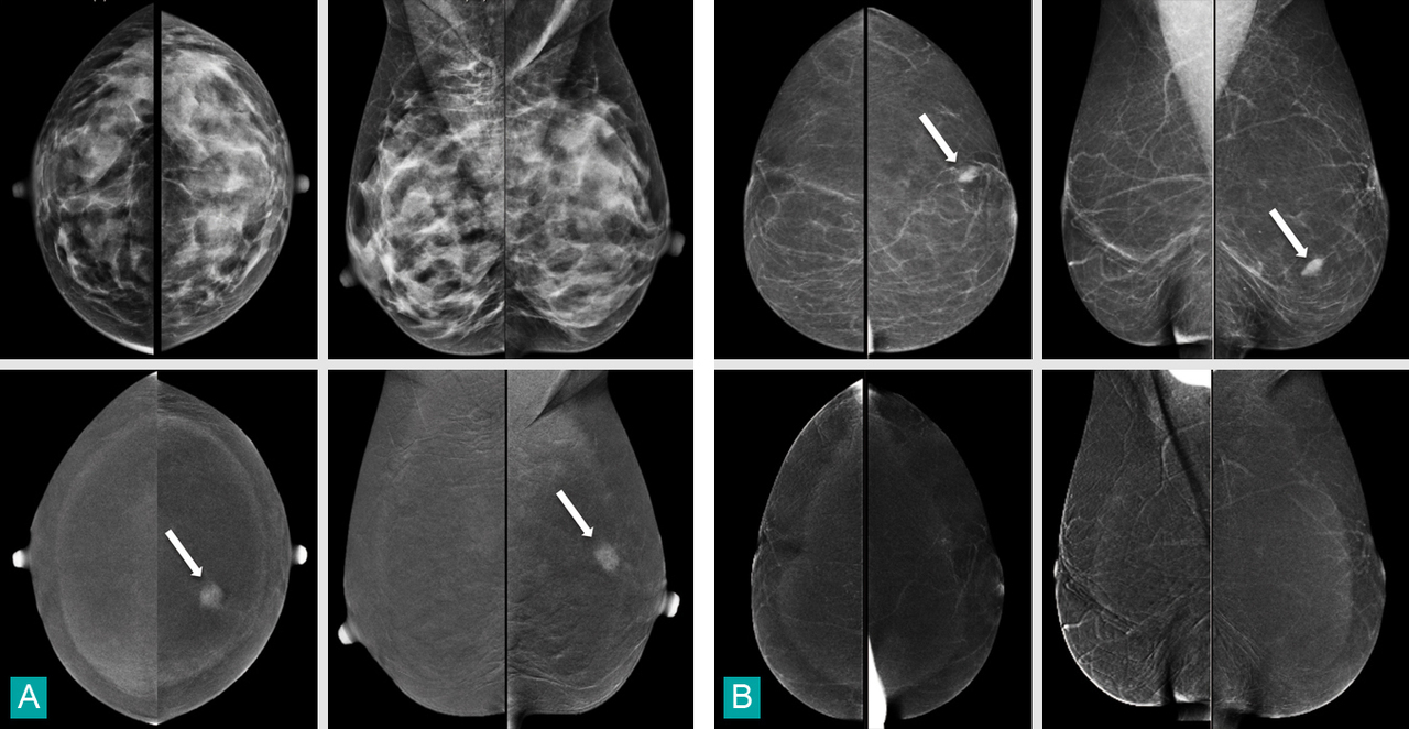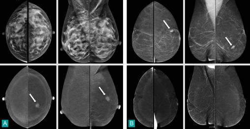 Mammographie : clichés du haut.Angiomammographie : clichés du bas.Chez la première patiente (fig. A), l'angiomammographie révèle la présence d'une masse rehaussée supéro-interne gauche (flèche), non décelable en mammographie en raison de l'hétérogénéité et de la densité glandulaire. L'échographie ciblée montre aisément une masse suspecte supéro-interne gauche qui, à la biopsie, révèle un carcinome canalaire infiltrant. Chez la secondepatiente (fig. 4B), l’angiomammographie permet de conclure que la masse dense ovalaire visible en mammographie dans le quadrant inféro-externe gauche (flèche) ne se rehausse pas, ce qui est en faveur de sa bénignité. La biopsie échoguidée conclut à une lésion de mastopathie fibreuse bénigne.