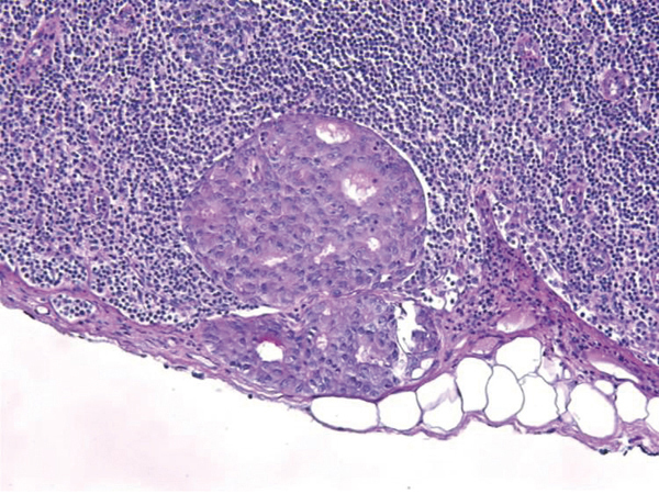 Tumeurs du sein - Coupe histologique d'un ganglion sentinelle montrant une micrométastase (< 2mm)