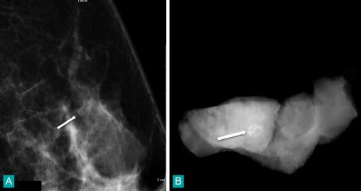 Patiente âgée de 59 ans chezqui l’on découvre l’apparition d’un foyer arrondi de microcalcifications dans le quadrant supéro-externe du sein gauche. Ce foyer apparaît dans le quadrant supéro-externe du sein gauche. Il est analysé à l'aide d'un cliché complémentaire en profil agrandi (fig. A), on le visualise au centre de l'image (flèche). Le radiologue le classe BI-RADS 4a et préconise la réalisation d'une macrobiopsie stéréotaxique. Cette biopsie est réalisée par un système d'ablation "monobloc" (Intact). On visualise le foyer de microcalcifications au sein de la carotte biopsique radiographiée (flèche) avant son envoi au laboratoire d'anatomopathologie (fig. B). L'analyse révèle un carcinome canalaire infiltrant.