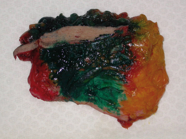 © Frédérique Penault-Llorca - La Revue du Praticien Pièce repérée par le chirurgien et encrée par le pathologiste, avec des encres de couleurs différentes afin de repérer correctement les limites d'exérèse.