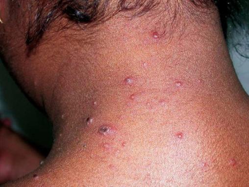 © Saskia Ingen-Housz-Oro (La Revue du Praticien) Évolution descendante des lésions qui débutent dans le cou et derrière les oreilles.