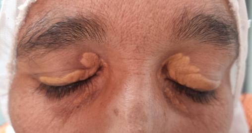 ©Dr Fatima Oulhouss Lésions jaunâtres en très léger relief, débutant au niveau des canthus médiaux, généralement bilatéraux et asymétriques. Extrait de : Image mystérieuse n°439