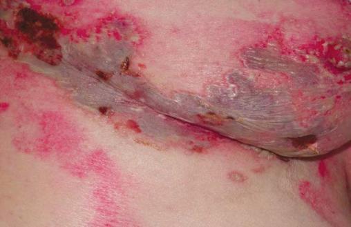 © Saskia Ingen-Housz-Oro (La Revue du Praticien) Zona thoracique à évolution bullo-nécrotique chez une patiente sous corticothérapie générale de longue durée pour polyarthrite.