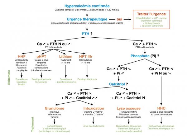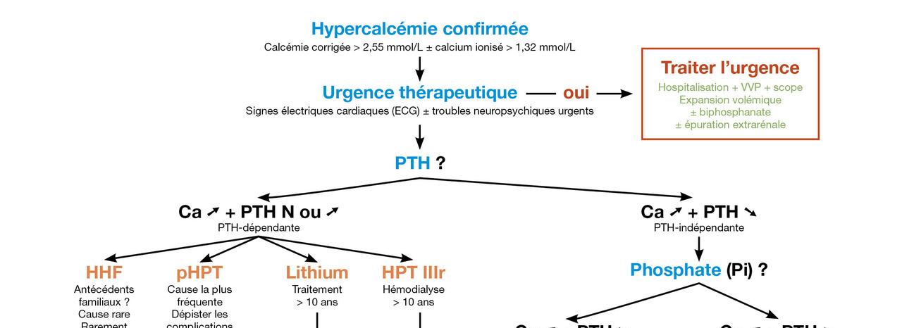 Une fois l’urgence vitale écartée grâce à l’examen clinique et la réalisation d’un électrocardiogramme (ECG), la démarche diagnostique consiste en la mesure de la concentration d’hormone parathyroïdienne (PTH). Dans les causes où la calcémie (Ca) est augmentée et la PTH inadaptée (donc PTH-dépendantes), on évoquera une hyperparathyroïdie primitive (pHPT), une hypercalcémie hypocalciurique familiale (HHF), une prise de sels de lithium au long cours ou une hyperparathyroïdie tertiaire (HPT IIIr). Dans le cadre d’une forme PTH-indépendante, la mesure de la phosphatémie (Pi) est utile : si elle est augmentée, alors la mesure de la calcitriolémie permet d’orienter le diagnostic. Une calcitriolémie franchement augmentée oriente soit vers l’existence d’un granulome soit vers une intoxication à la vitamine D. Une calcitriolémie normale (N) voire basse oriente vers une lyse osseuse. Enfin, lorsque la Pi est normale ou diminuée, il faudra considérer une hypercalcémie humorale des cancers (HHC).