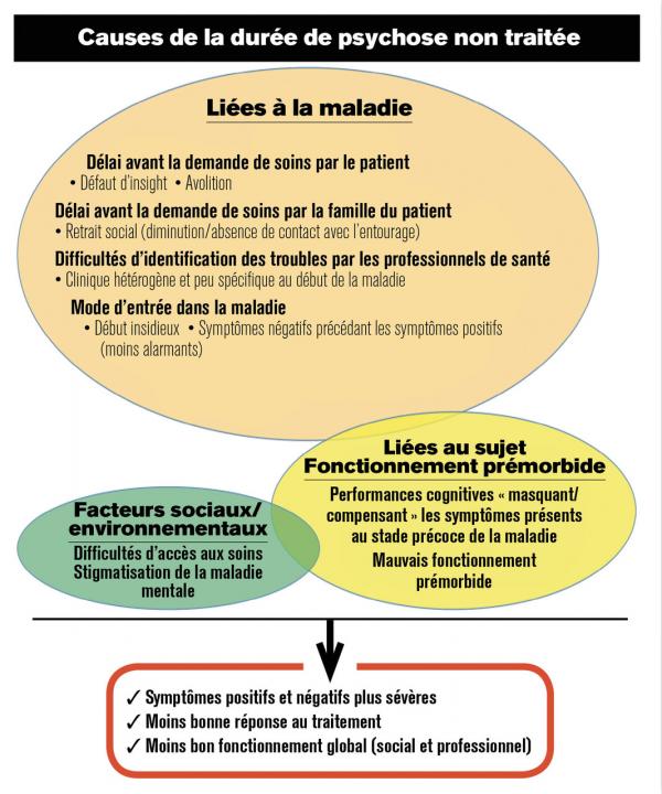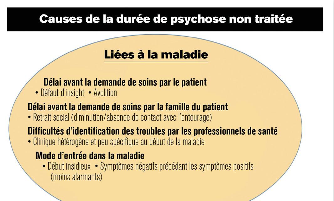 - des facteurs liés à la maladie : le défaut de conscience de la maladie (absence de conscience que des changements [dans la cognition, la perception...] sont la conséquence d’une pathologie : mauvais insight), certains symptômes de la maladie comme les symptômes négatifs, avec l’incapacité à initier des activités (dont l’activité de consulter un médecin : avolition), le retrait social (qui limite la possibilité pour les proches à s’apercevoir des changements/symptômes chez le patient), le mode d’entrée dans la maladie de façon « insidieuse » (instauration progressive des symptômes) plutôt que « brutal » ou avec l’émergence des premiers symptômes de type négatif qui interpellent moins que les symptômes positifs (idées délirantes et hallucinations) et peuvent mimer un épisode dépressif ;