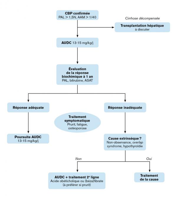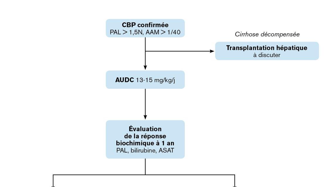 AAM : anticorps antimitochondrie ; ASAT : aspartate aminotranspeptidase ; AUDC : acide ursodésoxycholique ; CBP : cholangite biliaire primitive ; PAL : phosphatases alcalines. Lire aussi Exercice Dossier progressif n°242 Article Cholangite biliaire primitive Exercice Dossier progressif n°160