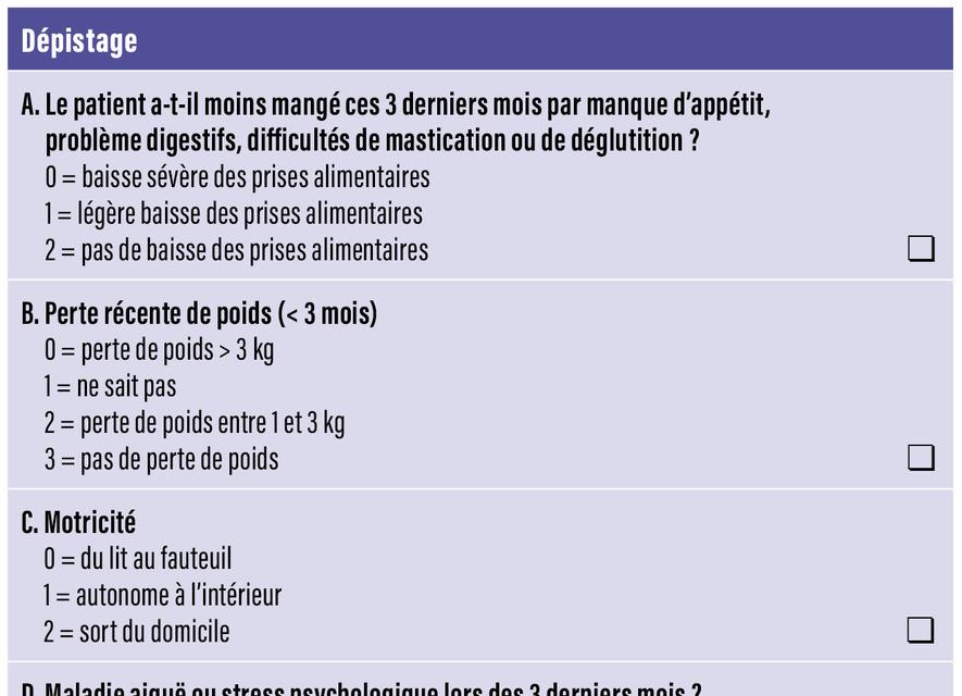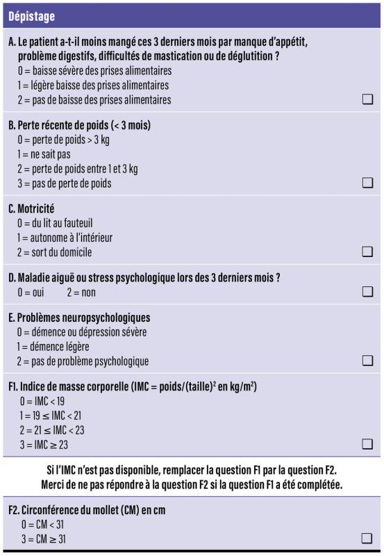 Dénutrition de l’adulte : Mini Nutritional Assessment-Short Form (MNA-SF). Version courte.