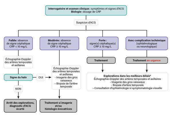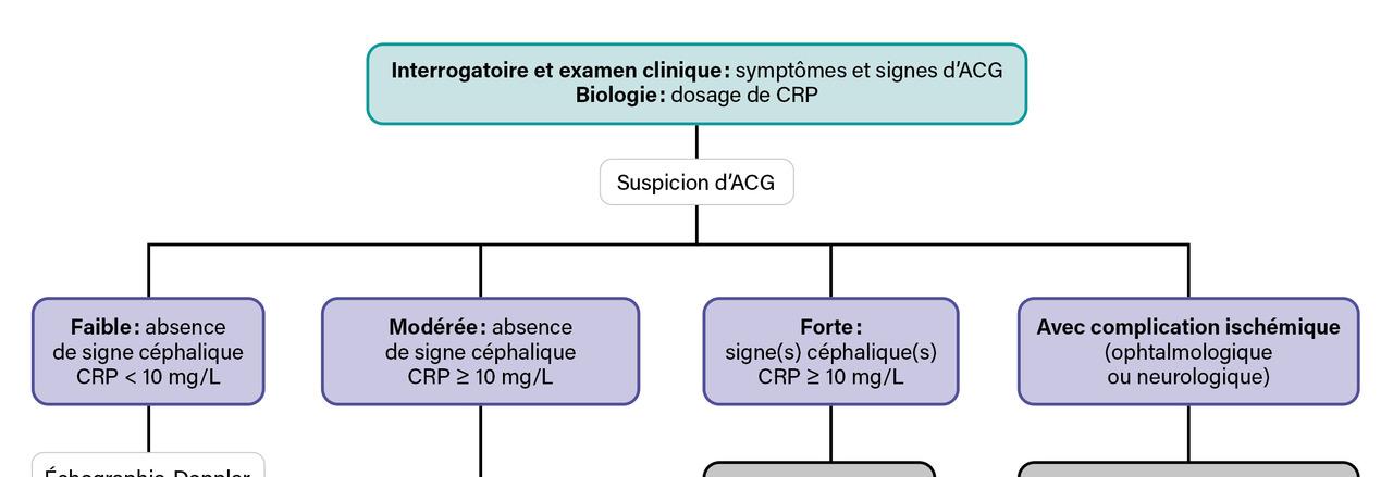 Extrait de : Diagnostic de l’artérite à cellules géantes Lire aussi Article Web Notre dossier – Vascularite des vaisseaux de gros calibre : du nouveau ! Exercice Image mystérieuse n°424 Article Traitement de l’artérite à cellules géantes Dossier Essor de l’imagerie et émergence de nouveaux traitements Article Épidémiologie et physiopathologie de l’artérite à cellules géantes Exercice Dossier progressif n°246