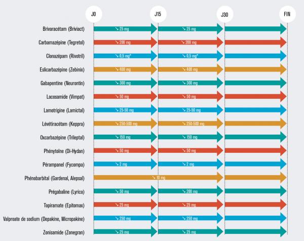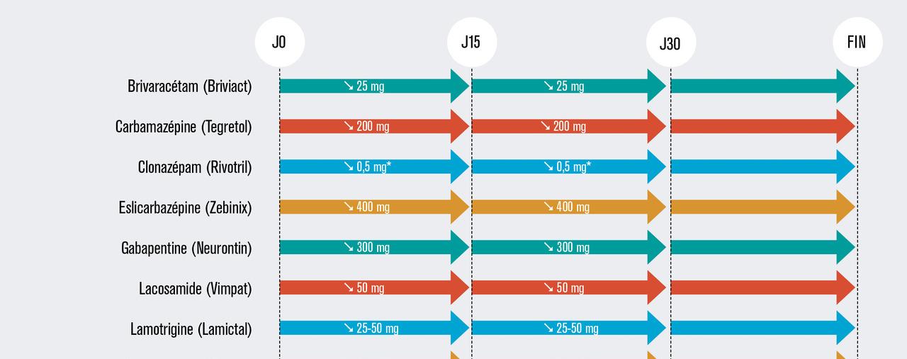 * Diminution du clonazépam sous forme de comprimés de 0,5 mg tous les 15 jours, ou de façon encore plus progressive lorsqu’il est prescrit en solution buvable (par exemple 0,1 mg [= 1 goutte] tous les 7 jours). Lire aussi Article Épilepsie de la personne âgée Exercice Testez-vous sur l’item 105 Exercice Vrai ou faux sur l’item 105 Exercice QCM sur l’item 105 Article Épilepsie de l’enfant et de l’adulte - Partie 1 / Épilepsie de l’enfant Exercice La pilule contraceptive diminue-t-elle l’efficacité des antiépileptiques ?