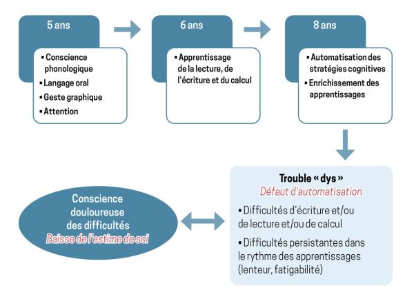 Figure 2. Extrait de : Troubles spécifiques des apprentissages (« dys ») et autres troubles du neurodéveloppement Lire aussi Article Web Troubles « dys » : dépister tôt pour éviter échecs et décrochage scolaires Article Troubles spécifiques des apprentissages (« dys ») et autres troubles du neurodéveloppement Article Place de l’outil modulable BMT-i dans l’évaluation des troubles de l’apprentissage Dossier La réussite scolaire a un impact sur la santé Exercice Dossier progressif n°19