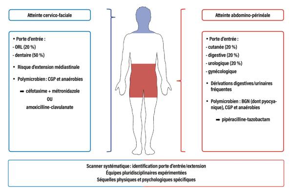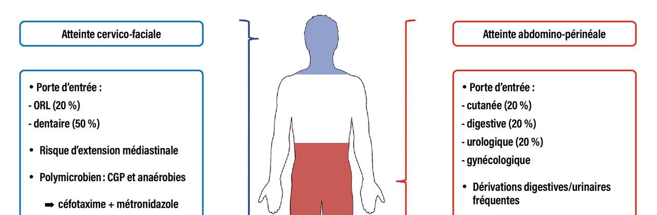Extrait de : Deux formes particulières : fasciite cervico-faciale et gangrène de Fournier Lire aussi Article Fasciite nécrosante causée par Cryptococcus neoformans chez une patiente immunodéprimée Article Web Notre dossier – Infections nécrosantes des tissus mous Dossier Chirurgie en urgence, antibiothérapie probabiliste précoce et traitement des défaillances d'organes Article Prise en charge à la phase aiguë des infections nécrosantes de la peau et des tissus mous Article Diagnostic des infections cutanées graves, épidémiologie et sémiologie clinique Article Implications thérapeutiques de la microbiologie des infections cutanées graves