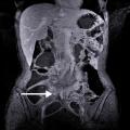 Volvulus du cæcum sur une coupe frontale de tomodensitométrie